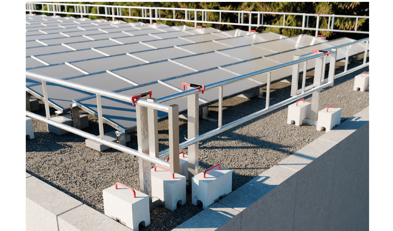 Parapetto anticaduta provvisorio per tetti piani. Realizzato in alluminio leggero con interasse montanti fino a 3 mt e zavorre in calcestruzzo da 25 kg. Ideale per coperture con fotovoltaico o ostacoli, permettendo l’installazione vicino al cordolo. Sistema pratico anche nel trasporto con un contenitore che accoglie fino a 30 mt di parapetto.